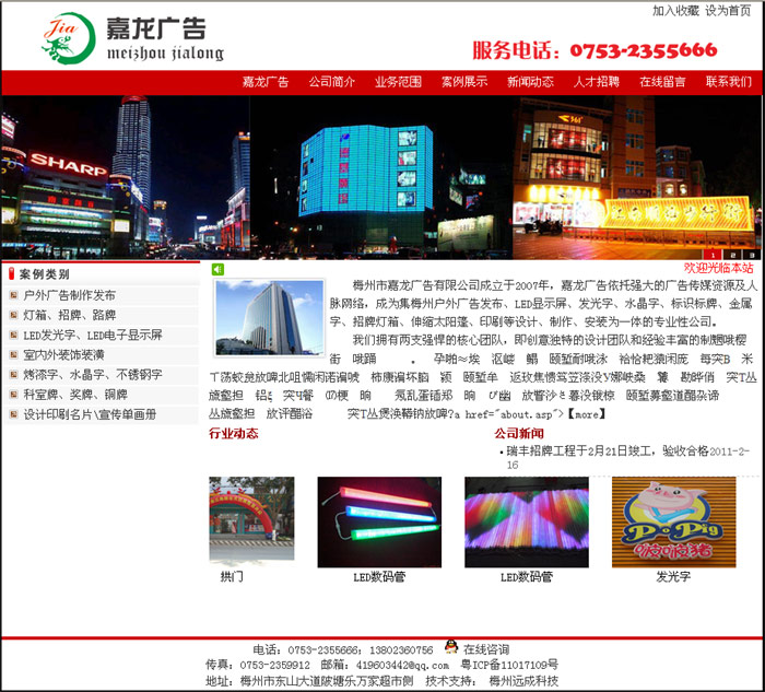 梅州市嘉龙广告有限公司成立于2007年,嘉龙广告依托强大的广告传媒资源及人脉网络,成为集梅州户外广告发布、LED显示屏、发光字、水晶字、标识标牌、金属字、招牌灯箱、伸缩太阳篷、印刷等设计、制作、安装为一体的专业性公司。
