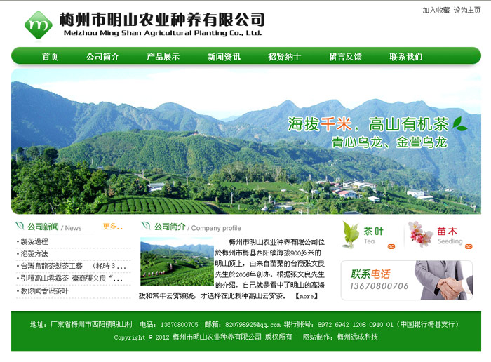梅州市明山农业种养有限公司位於梅州市梅县西阳镇海拔千米的明山顶上,由来自苗栗的台商张文良先生投资创办。秉持诚信负责,人文为本的精神;坚持不用农药,发展高山生态有机茶,让人人喝得安心健康,用精湛制茶工艺制出绝顶好茶。